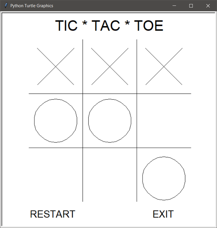 turt.write('TIC * TAC * TOE', move=False, align='left', font = ('Arial', 30, 'normal'))