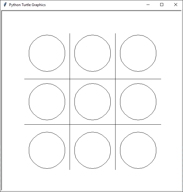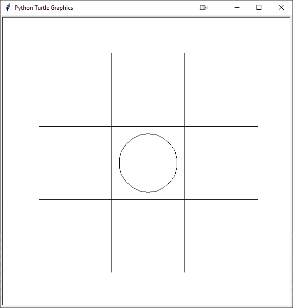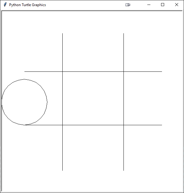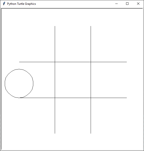 Based on the dimensions of 600×600, I can estimate where to place the lines. Turtle uses 0,0 as the center of the window. If I were to cut the window straight up into thirds, all the lines would land at +-100 and go from +300 to -300. I want the board to be a bit smaller as later I’ll add a title and maybe a score and some buttons and instructions at the bottom. The above code looks a little off center, so I played with the numbers a bit and came up with 75 instead of 100, for a nice balance. This goes in the code and is called after it’s created to draw the board, then a random circle, because the circle currently just draws from the last position of the drawing.