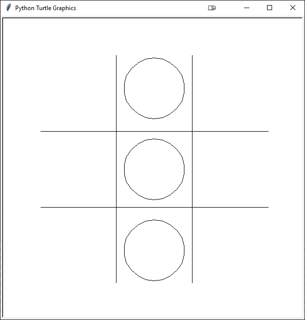 screen.exitonclick()Now it’s time to do the rest of the circles. Which are a bit more trial and error. I’ll reduce the code a but for readability, but basically, the draw_circle function call gets put in a for loop for each of o_coords. So the end result will be the TicTacToe board with all 9 circles. This won’t be in the final product, but it allows for quick testing. It’s easiest to break this down into seperate columns, so everything in a side columns gets drawn way off screen at 5550×5550, just because it was easy to tap “5” a bunch. The top and bottom get drawn and adjusted. Keep in mind, the circle command draws “from the bottom” so the coordinates are not centers.