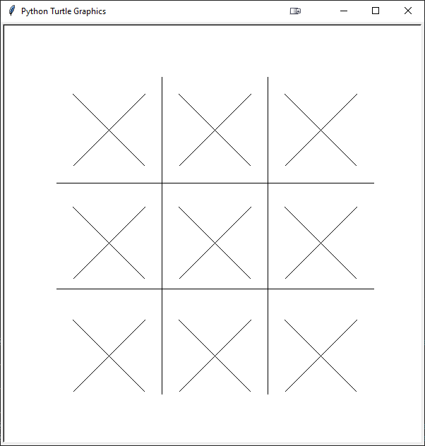 screen.exitonclick()The next step is to do pretty much the same process for the X shapes. Though I’ll also have to set up how to draw the X shape first, so I can figure out where the start is. Which leads to a bit of adjustment and change of plan, which is not uncommon. I don’t need a second set of coordinates, I can use the same coordinates, and slide over to the start within the drawing function. I set up an initial batch of X shapes, only to find I had lines going everywhere. The “Left and Right” functions turn based on the last orientation. So I’d need to realign the turtle at the end of each call. After some futzing, I had a good set of X shapes going, one for each square.