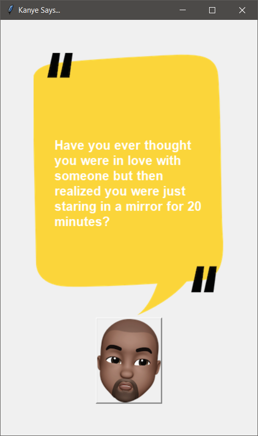 We also made a silly little Kanye Quote app, that pulls and populates Kanye West quotes to a quote box with a little cartoon Kanye.