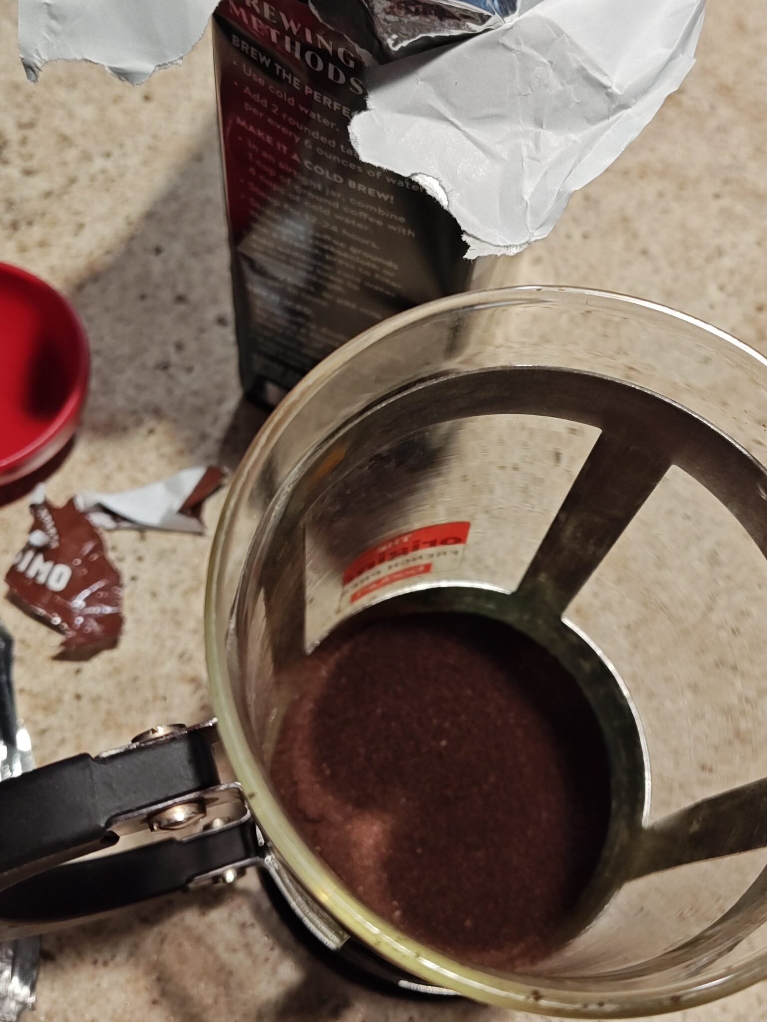 Let’s do a “boring post”. I bought a coffee brick. It’s not fancy, it came from Aldi. Hell, it’s possible this is the “least fancy” way to make coffee. Most of the time these days I buy beans and hand grind them, but I like to keep alternatives in case I am feeling lazy. So I decided to try the “brick coffee”.