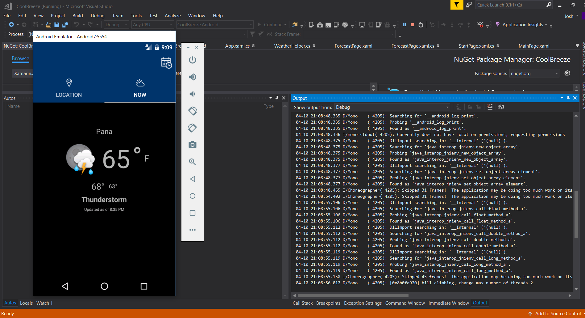 For example, I had issues getting the location based weather to work, until I went through and updated the Android Emulator files and build an emulator that ran on Android 7. In a later step I found several of the NuGet packages weren’t installing properly, I never really figured out why but I ended up having to add them individually to each of the app platforms rather than the blanket “Install this on all platforms” system.