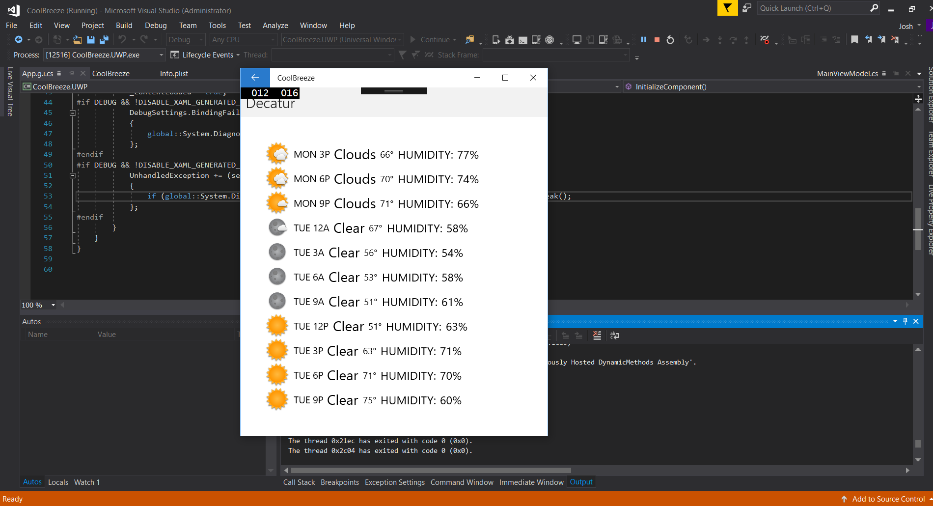 So, I made an app. A for real, runs on things app. More accurately, I followed a little tutorial to make an app, as part of the Xamarin Challenge over at Thurrott.com. The app itself is a little weather app, it even includes location based weather and forecasting. I know this isn’t particularly impressive but I think it’s pretty neat.