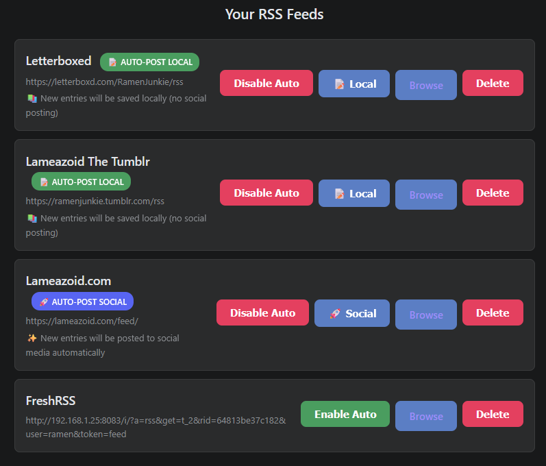 So I asked Claude to add a toggle for if auto posting feeds get shared or not. Once again, its good to know what files are relevant and what code is needed. I fed it back the main app script, but I knew it would also need to add buttons to the RSS Settings page, so I fed that in as well. It updated both files, I slipped them back into the main app and the new functionality was there and working.