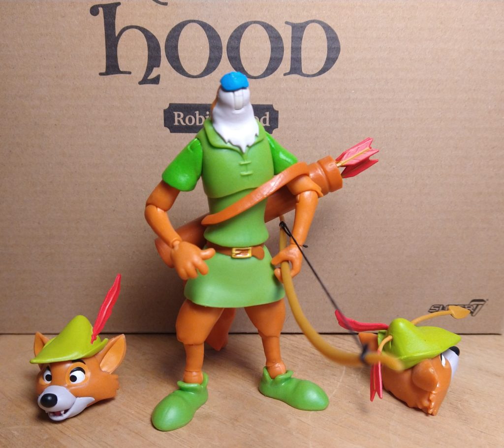 So, wow. I feel like I am pretty good at picking out good parts of figures to keep my disappointment levels down, but this figure… I just can’t. And I am not sure how this happened. One of the worst signs that a figure is a mess, is when it breaks, doing basic actions, almost right out of the package. Which happened here. I have gone through tons and tons of figures, and very few just break, right out of the package, with basic operation. Especially on a “Premium” level figure like this, the Disney Ultimates Robin Hood from Super 7.