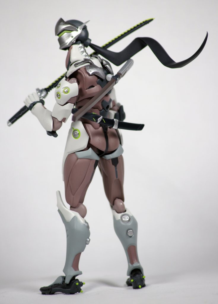 Genji actually is quite a departure from Tracer. I mentioned how his cyborg design works for the articulation, and it definitely shows, he is quite a bit more articulated than Tracer. Almost too articulated if that’s possible (side note, it is, look at any AY Revo). He neck and shoulders in particular have a sort of double ball set up going that let them extend quite a bit. It actually makes his shoulders look odd at times and his neck definitely feels too long if you are looking at it from the wrong angle.