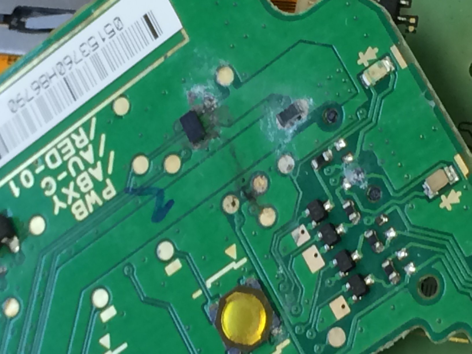 Once everything was dried, I reassemble it and tried to turn it on again, with no success. So I opened it up again for a deeper inspection. This was when I found what I should have noticed originally, the painfully obvious blown out components on the board.