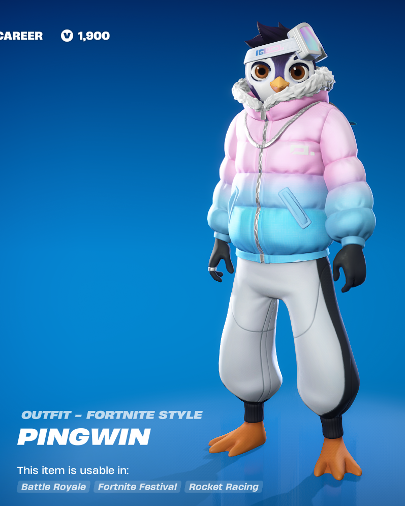 I want to throw in one last honorable mention for my current favorite skin from this season, Pingwin. Its a shop skin, I skipped the pickaxe and back blink bundle, the skin alone was surprisingly cheap, like 800 vbucks. I expected more like 1200 or 1500. I just super love pinguins and the color are nice. I mentioned not really using furry skins back when commenting on Kingston but technically pinguins have feathers not fur.
