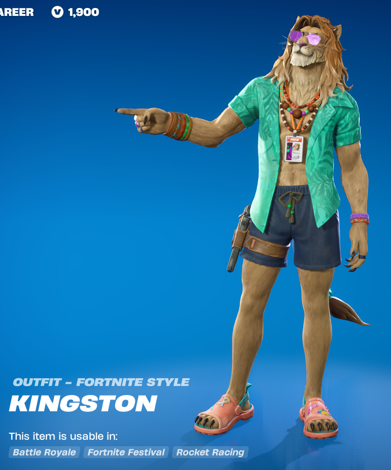 Back to original Fortnite skins, we have this lion dude Kingston. Fortnite has tons of anthropomorphic animal skins. This Lion dude feels quite a bit more detailed than most of them though. Its a pretty nice skin, but I don’t really use furry skins.