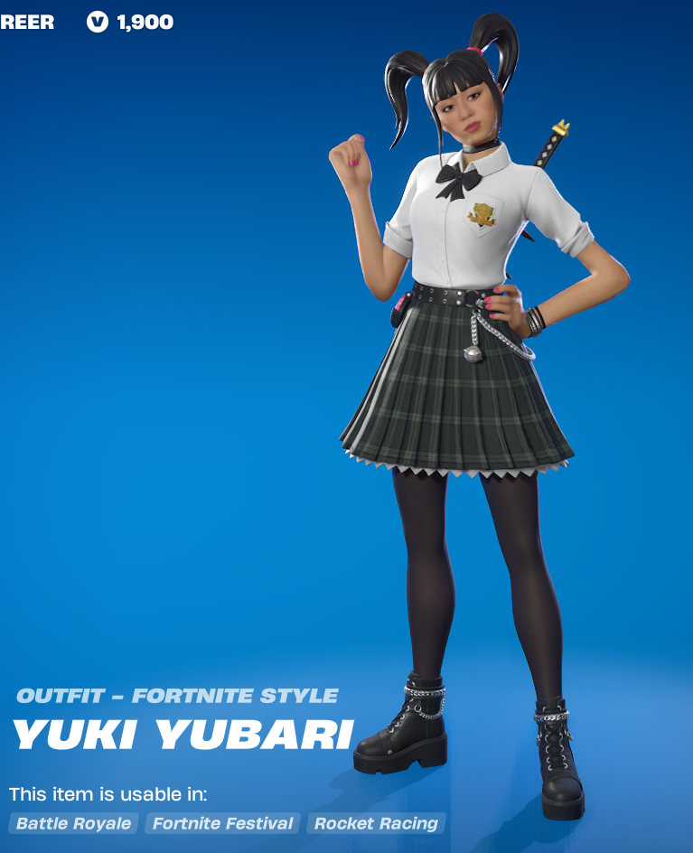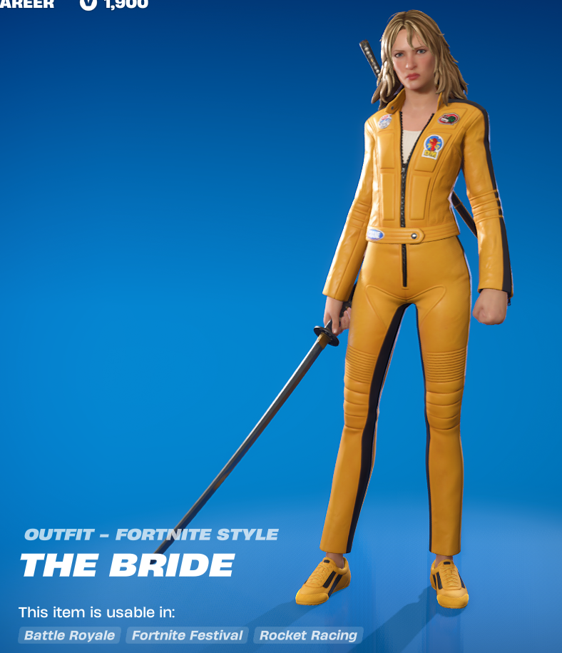 She has an alternate style of her brown jacket casual look as well. The likeness is honestly pretty good for all of the Kill Bill stuff, while keeping the Fortnite style.