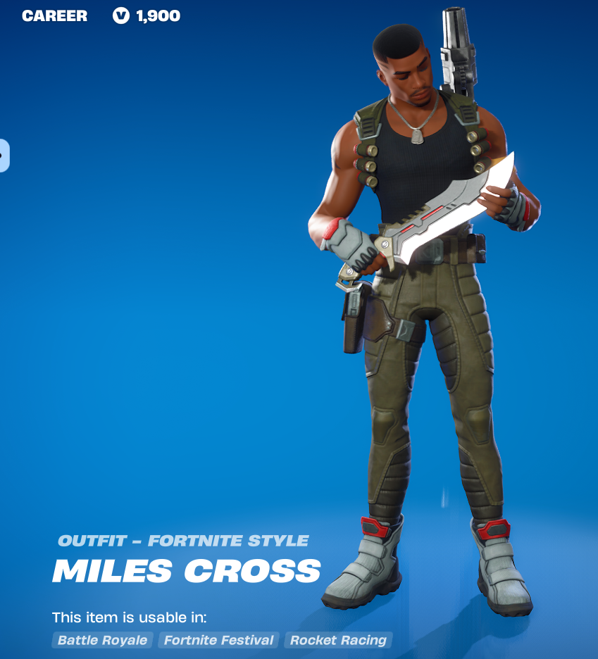 Then there is Miles Cross, who also feels a bit boring. He looks like a more detailed Default skin. And for some reason he has a War Machine turret strapped to his back. I’m actually surprised they went with that, they usually avoid having skins (more often pick axe skins) that look like in game weapons. It helps avoid visual indicators of what gear opponents may have.