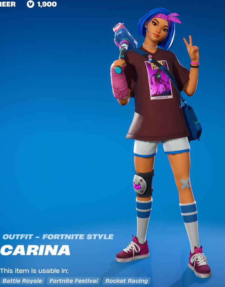 Next up we have this chick Carina. It seems like she is supposed to be a sort of stunt camera woman with the camera pickaxe and her skateboard themed accessories (emote and back bling). I want to like this skin but kind of don’t. I can’t really place quite why, something feels really off about it, and as dumb as it sounds, I think its the arm cast.