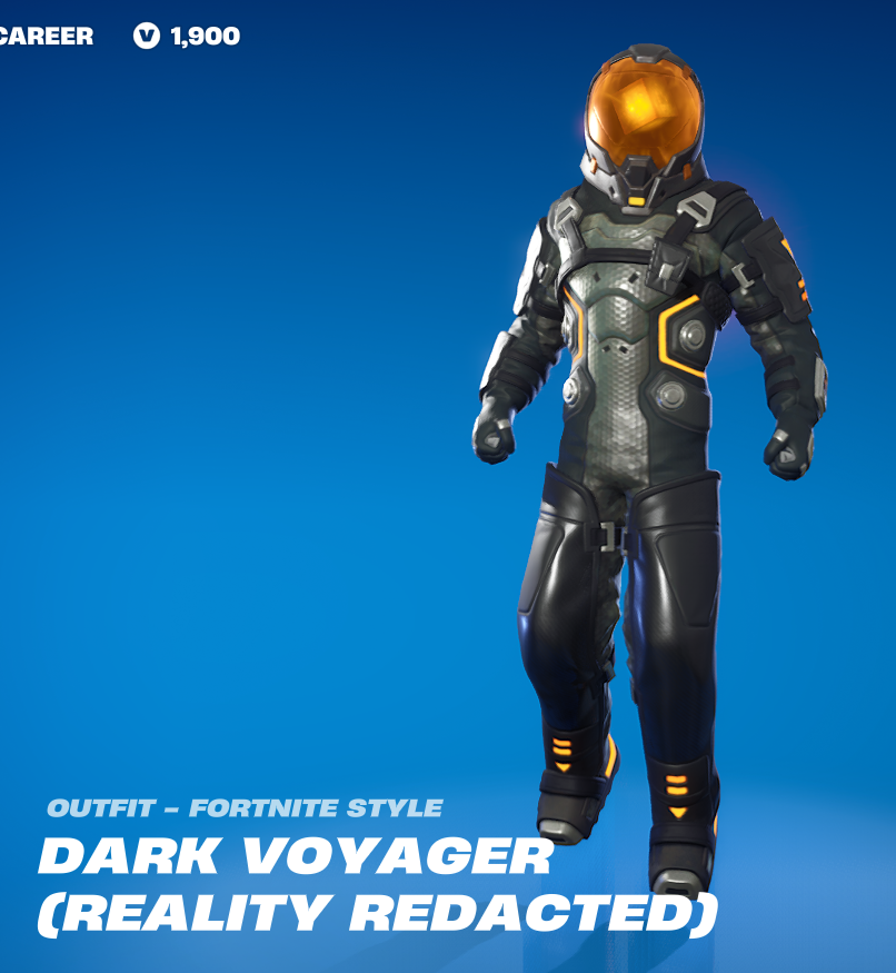 Lastly, we got a lore skin. The Dark Voyager, and presumably, villain of the season. He comes from The Last Reality I believe, which is a group that has been trying to destroy other realities, or something. The Lore has been a mess for a while, I don’t know. He reminds me of a Metal Gear Solid villain for some reason. Also he just sort of looks like an evil astronaut.