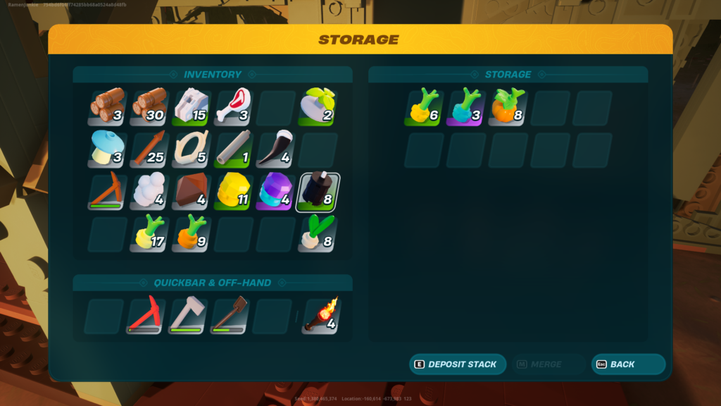 But it’s a survival game, those are more just complaints about the game having gameplay, so I can accept them. But managing all of this is even worse. items don’t automatically group and stack, for example. They stack to stacks of 30 or so. Say your chest has 4 of an item, you “deposit all” on a stack of 5. It now takes up two slots. You can manually stack them, but the entire point of quick keyboard shortcuts here is not to have to hassle with manual sorting. That 5 stack should drop into that 4 stack and make a 9 pile on its own. This feels nitpicky, but when you constantly have to do it, it gets old, very fast.