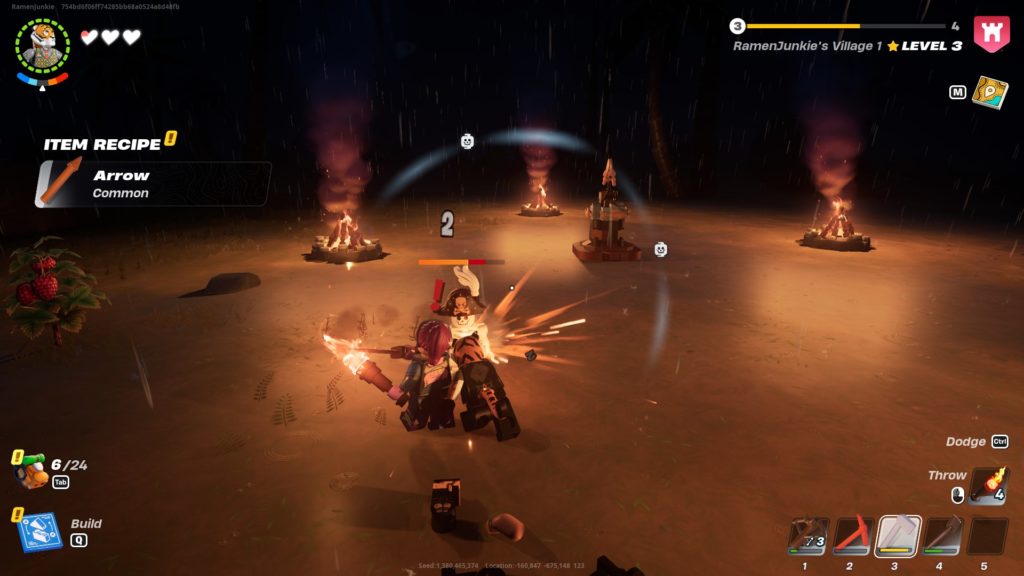 Since we are on Campfires, it’s probably worth mentioning the weird temperature mechanic of the game. I’m sure there is a way to become too hot, but when it rains, you can become cold, which is bad. The game tells you this, it’s basically, “Get to shelter.” Standing next to a campfire does not work. You would think it would, but it does not keep you warm in the rain. It also does not heal you like in Fortnite BR either, it just provides light. You also can’t build or interact with anything in the rain. This all is a bit annoying because the best solution is to build a giant roof over your entire village, which feels a bit, not very village-like.