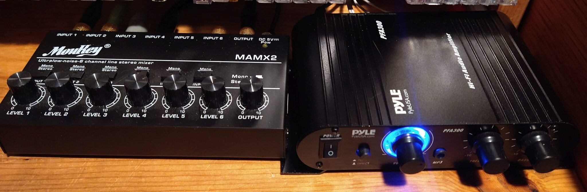 I originally bought the mixer for use at my PC, I wanted to be able to play games on one machine, and watch a video on another machine, and merge the audio out one headset. That didn’t really work out to be as useful as I had hoped, but instead I get to use the mixer for my music instead. The amp I bought to go with some nice JBL speakers I had, that needed 2 wire connections to work, also connected to the PC originally. Except I never ever use anything but a headset on my PC, so it was a waste.