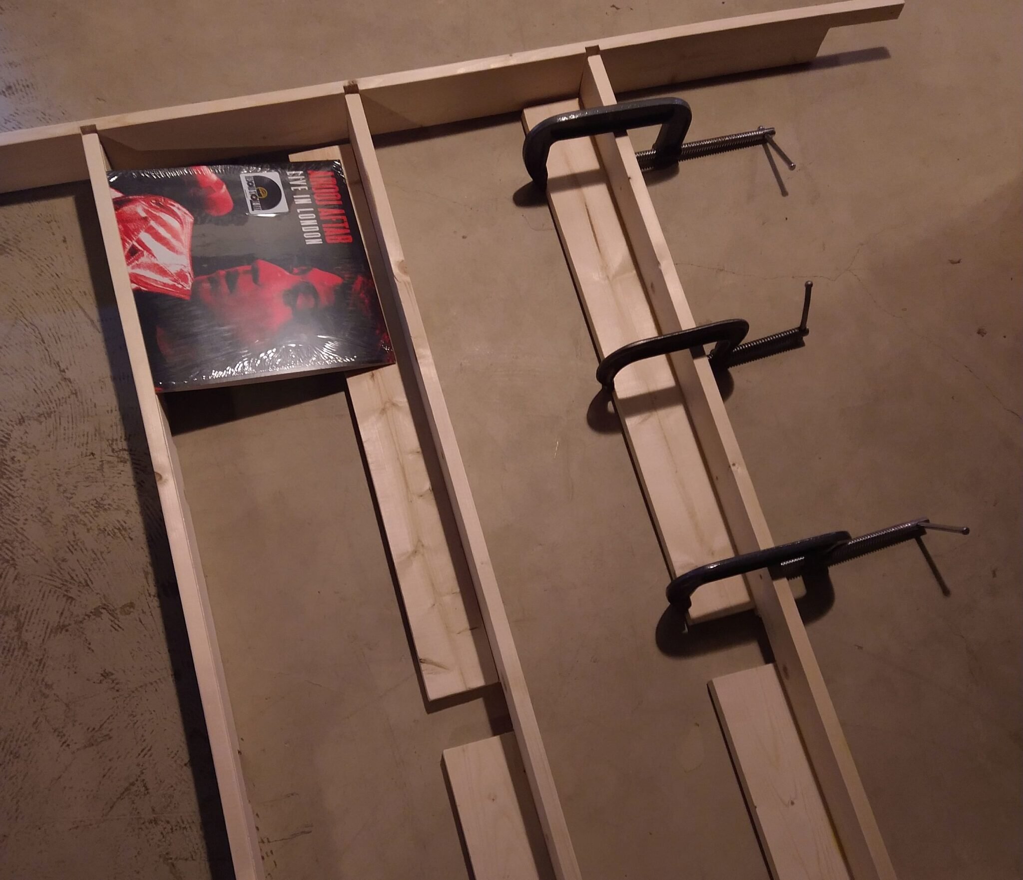 The shelf itself is a handful of 1×4 pine boards. It’s a bit more complicated than it might seem at first. For starters, I like the look of inset joints over just using metal L braces, so I went and inset and glued the shelves inside the sides. This was a bit tricky because I don’t actually own any bar clamps. I also added the little back catch pieces under each shelf, so the albums wouldn’t be resting on the wall itself. This was slightly complicated because there is a power conduit running down this wall i had to work around. The shelves themselves are notched around the power conduit as well. I also only have so many clamps large enough to glue these, so it took like a week of “clue one piece then come back.”