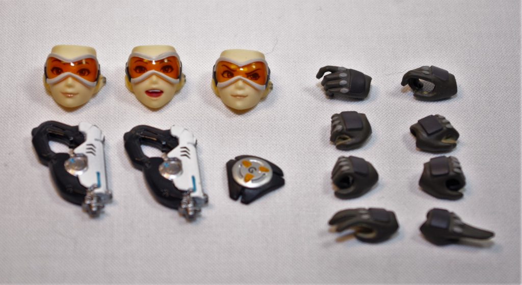 Unfortunately it’s not a perfect likeness. The worst offense on this toy is the face. It’s just… off… all over. It’s almost like it’s a sort of bizarre bishoujo version of Tracer. There is definitely too much “anime” in the sculpt. I mean, Overwatch is pretty heavily cartoon in it’s stylization, but it’s not manga styled. It’s kind of funny because the Nendoroid version almost looks more like Tracer in the face, despite the goofy proportions.