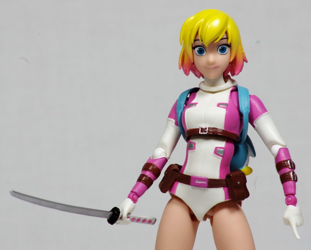 I have some other minor complaints. The worst offense is that she really needed a second unmasked head (there is one coming with the upcoming Evil Gwenpool figure). Basically just the smiling mouth on the unmasked head. The unmasked head also had some iffy paint app choices, mostly on the mouth, though I’ve seen some light touch ups done by folks that really improved it. I also kind of hate that she can’t wear the animal backpacks and the sword backpack at the same time. Not a huge issue, but it would have been a nice addition.