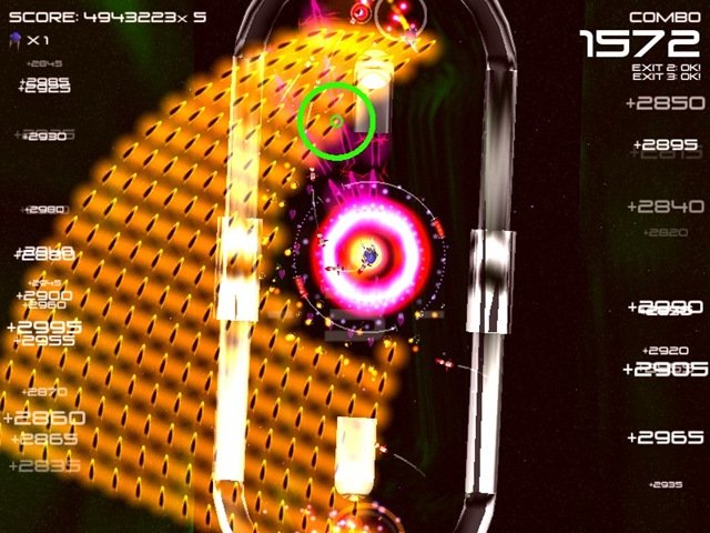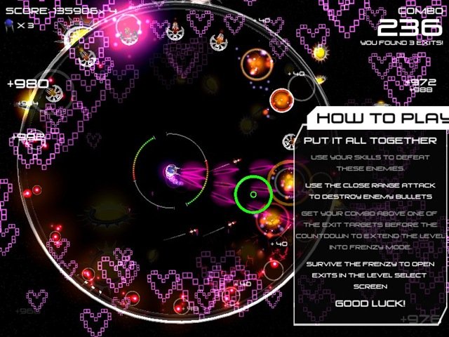 The gameplay is pretty straight forward, fly your ship around and shoot in different directions destroying hordes of enemies. It’s similar to Beat Hazard or Geometry Wars, or even, Asteroids. You do have the limitation of your movements being trapped within a small confined area. The game’s main draw is it’s progression system. The more enemies you shoot in a row without dying, the larger the combo you build up. Depending on the size of your combo you will unlock different stages to move on to. The fun part is, you can choose which stage to go to next. Each one is labeled by it’s difficulty so if you’re wanting to try something easier for a bit, you can pick the Easier stage, if you suddenly have a desire to challenge yourself, you can slip into a much more difficult stage, assuming you managed to unlock the higher difficulty.