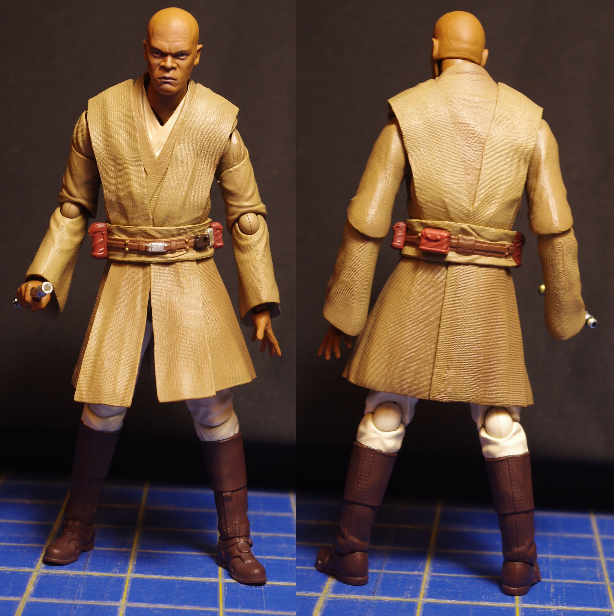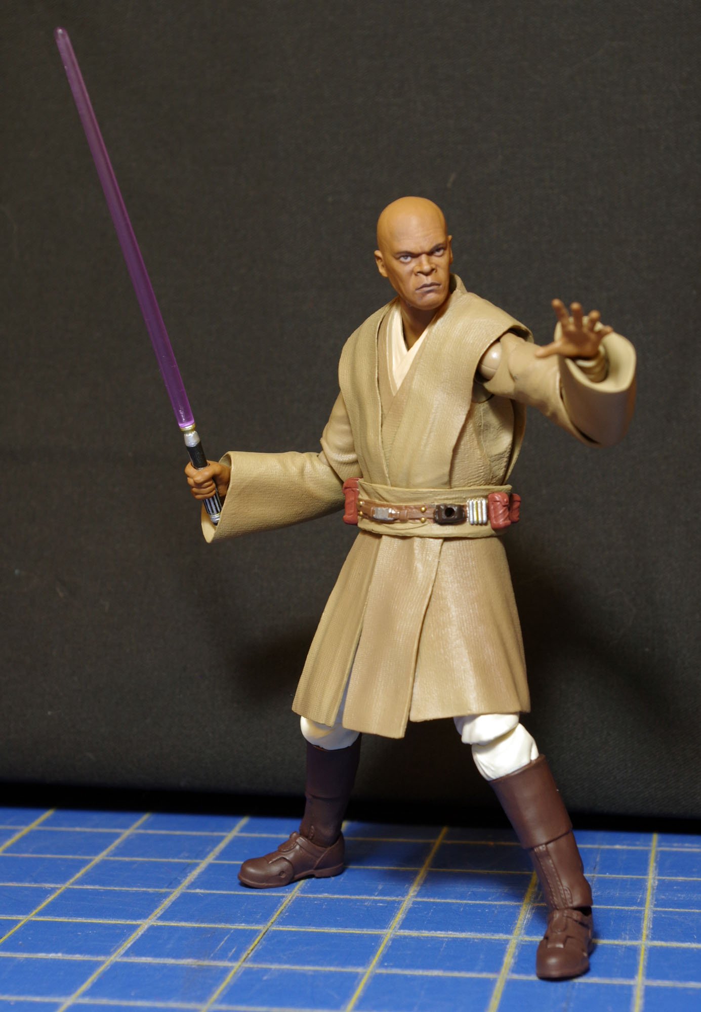 Mace Windu includes 6 sets of hands, and 2 heads, one angry and one more smug/neutral. He also includes 2 light sabers, one with a peg to hang off of his belt and the other to be held, with or without the blade.