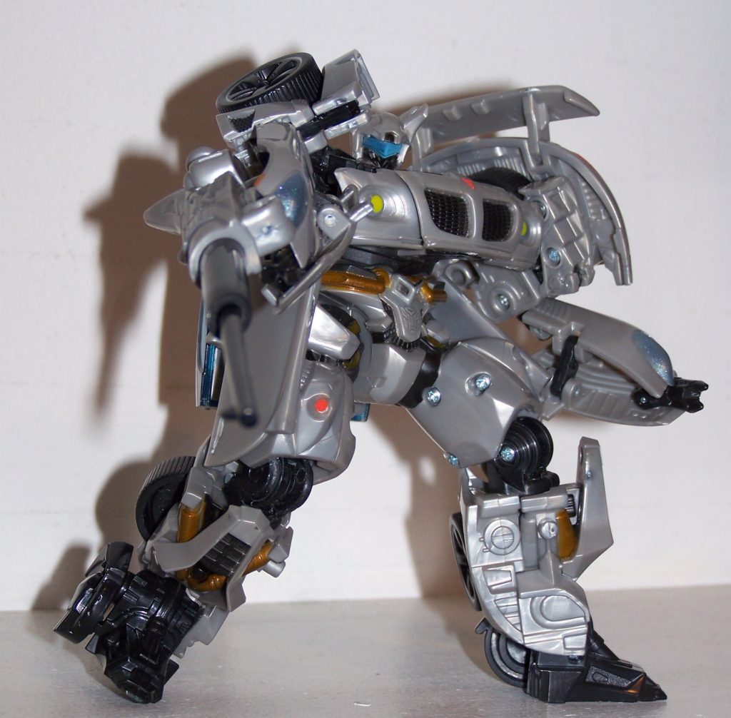 Like his G1 counterpart, and like many of the toys in the movie line, Jazz’s transformation involves the hood forming the chest of the robot with the rear forming the feet. I’ve always felt that this visual style works well for Transformers but almost every toy in the line, especially the deluxe class, use it and it actually comes off as a bit boring. Jazz is one that deserves it the most though of the entire line and he pulls it off the best. It’s pretty much the only visual cue that matches him to his G1 counterpart however. The head, arms, legs are all alien movie designs. The irregular and rather odd style takes a bit of getting used to, especially after the more streamlined designs of Cybertron but it actually works pretty well. The arms are the worst part of this toy. His hands are these tiny claw things that just sort of jut out from between two flat panels. The forearms have no real solid substance to it and he doesn’t even actually hold his weapon.