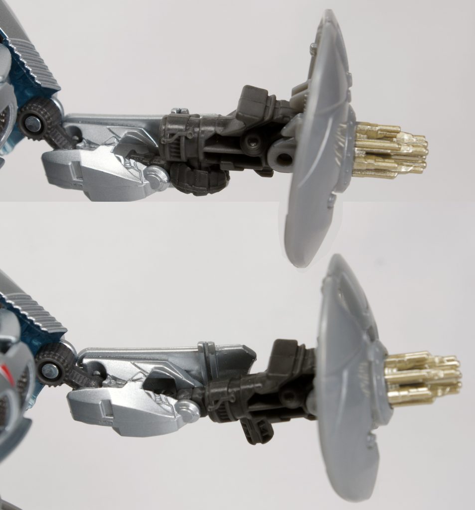 There is also this really need trick with his gun. It’s not as original of an idea as the chest, but the gun can be held by a standard 5mm peg fist, or the fist can be folded in and the gun attached to the end of his arm. It replicates the way the guns in the movies would sort of transform out of the robot arm. The clip isn’t super strong though, so it tends to fall off if bumped the wrong direction. It’s also nice to have a movie Jazz with real arms, and not the weird hollow arms the original had.
