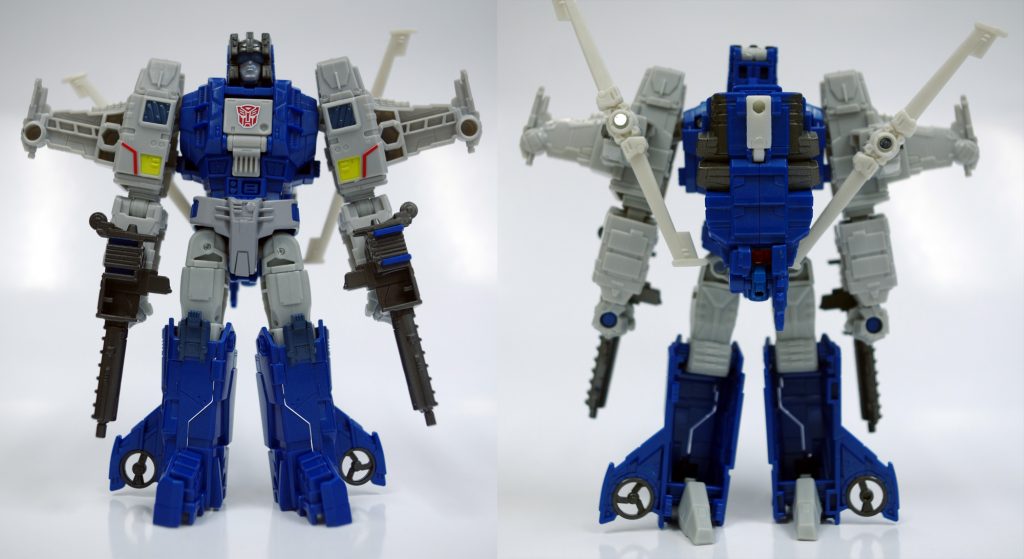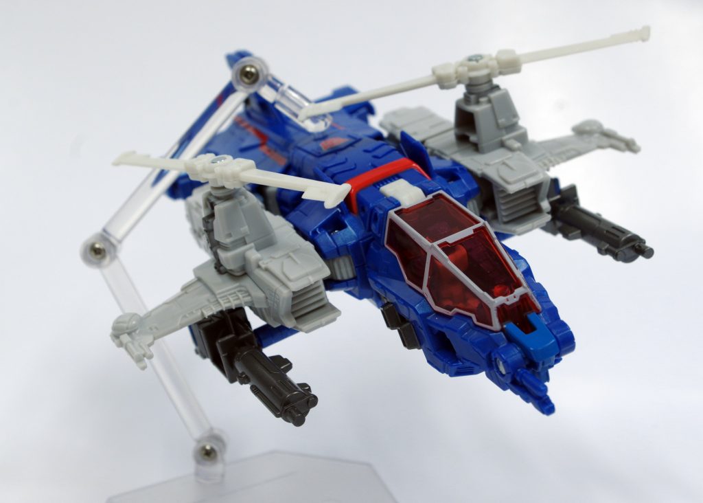 The toys are definitely different enough to warrant owning both of them if you are interested in both. The transformation results in a pretty near little helicopter. The cockpit is functional to allow for the Titan Master to fit inside. The two guns can attach to the underside of the wings to give the chopper some artillery, though they attach via the non round pegs, which is slightly against what you commonly see but it allows for the use of the molded landing wheels. There’s a third flip out landing gear that isn’t super obvious on the under side of the cockpit.