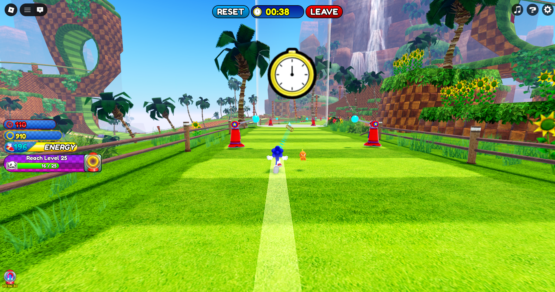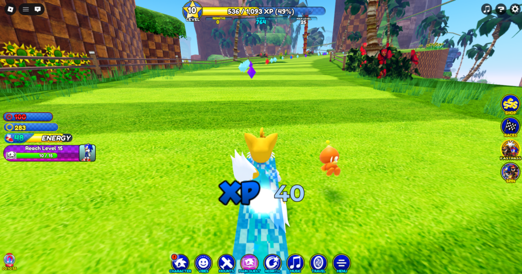 Otherwise it plays like an open world 3D Sonic game. Which is extra amusing because until you unlock characters, you play as your little Roblox avatar. Speeding around, roll dashing, jump attacking enemies. Its kind of funny. The game also lets you unlock skins as you progress through the experience levels, which you earn super fast. Green Hill zone has basic Tails and Sonic.