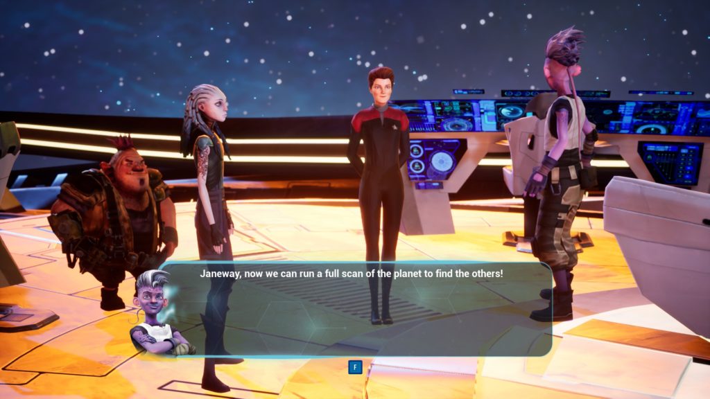 Its also notable, unlike the Transformers game, all of the voice cast here is the same voice cast from the show. Including Kate Mulgrew as Janeway. In fact, given the 3D CGI styling of the show itself, this game looks, very much like the show as well.