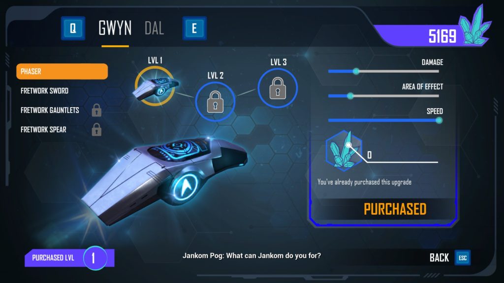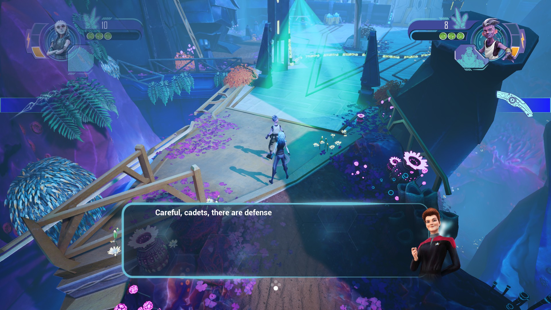 The base gameplay has you controlling Dal and Gwyn, two of the show’s maim characters and crew. The rest of the crew shows up as well, Janeway runs mission, this dude Jakom-Pog is engineering and lets you buy upgrades. There is a big rock girl, named Rok-Tahk, a little robot named Zero, and a slime called Murf. I’ve seen these characters in promo materials and they seem to be everyone important to the core plot. Though most of these characters have to be unlocked as you play, for plot reasons.