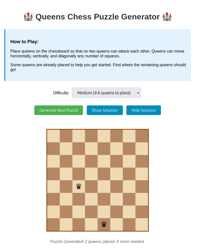 It created a game where you had to place queens on a chess board, just, not the game I wanted, where you have one in each column and row in each color patch, like the Linked in game.