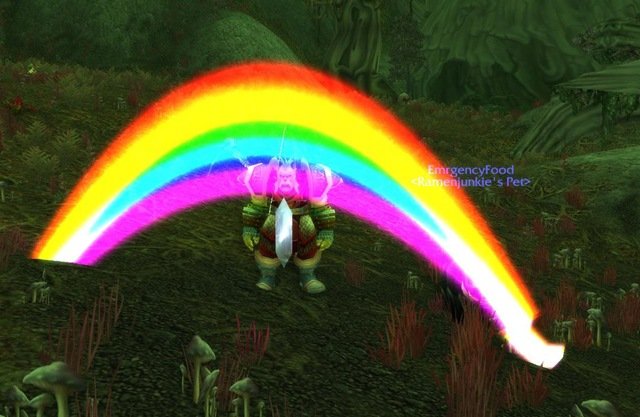 Sadly, this rainbow effect is only for one quest. Not sadly, the quest reward trinkey instead shoot Rainbows from your fingertips which causes (weak) damage to things. It’s not enough to use as a weapon but it will kill critters. Irritatingly, it was like a hour long cool down. Anyway, it’s hilarious on my Orc Hunter, because I purposely designed my Orc hunter to be ugly and grouchy looking.