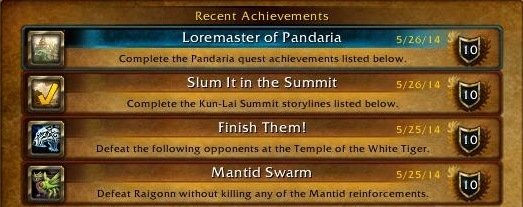 My latest efforts have been to pick up on some of the missing achievements for Mists of Pandaria. Specifically, the questing related ones. I started with the Lorewalker storyline, which mostly involves traveling all over the continent of Pandaria and reading little story lines on scrolls scattered about. This gathers reputation with the Lorewalker faction, and gives and achievement. Having Exalted reputation with the Lorewalkers allowed me to buy a new Cloud Disc mount, but it’s kind of a boring crappy mount. If i am going to surf on a flat mount, I’ll stick to one of my flying carpets.