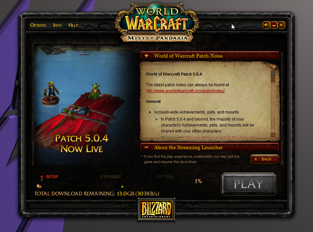 Instead I’ll make a comment on the recent patch, which seems like a huge mess, quite literally. I went to play yesterday on my Laptop only to find the game had to patch, then do some sort of crazy reconfigure. This is mostly in preparation for the upcoming Mists of Pandaria Expansion. The process of getting to the Reconfigure stage took like a half hour or more, and then, it starts downloading a 10GB (13 on my desktop install) Patch. GIGABYTES. At the speed it said it was running I was looking at a 12 hour download. There isn’t a better way to handle this? Really?
