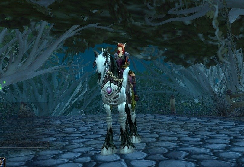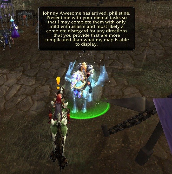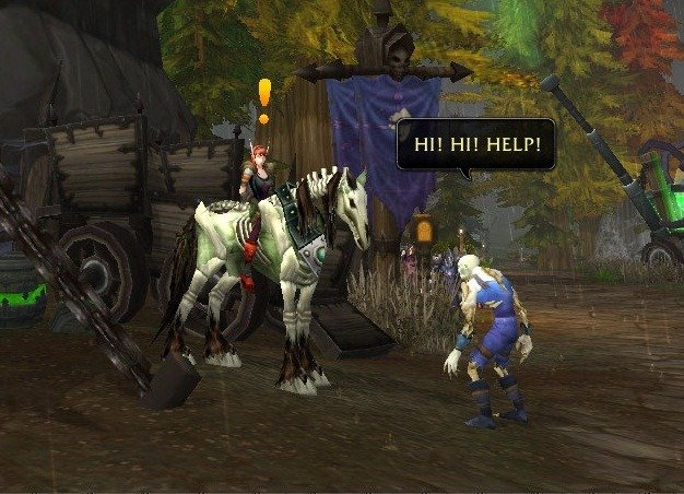 No, I didn’t make a new character, I started doing Undead quests, from around the low level first quests. Why bother? I learned I could buy mounts from other factions by becoming “Exalted” in reputation, which meant doing a lot of quests for that faction. The Blood Elves have their own mount that I can buy at any time simply because I am one of them. It’s a huge goofy Chocobo Knockoff. It bobbles around as it runs and is generally not real intimidating. While wandering around previously in Orc Territory I tried to buy a Raptor off of a Troll but he told me to piss off. Later, I found out the Undead get bad ass Skeleton Horses. A creepy Undead Horse seems like a much more awesome and intimidating mount for a Blood Elf Fury Warrior, and I wanted one. Which meant becoming Exalted, which meant doing loads of Undead based quests.